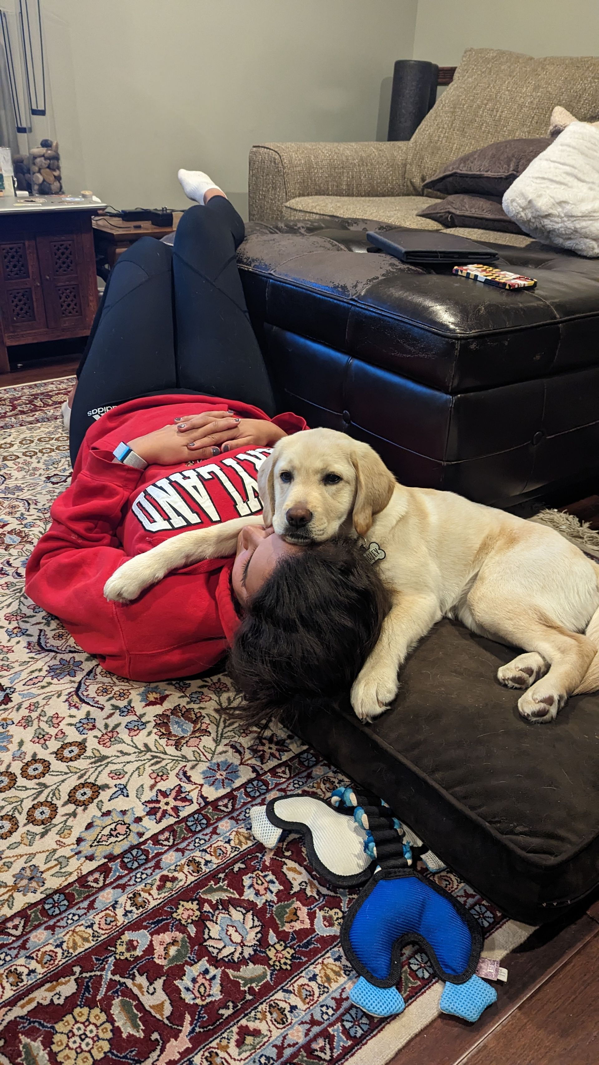 On January 24 (3 months post-surgery) I got cleared to finally take the brace off and start doing more flexibility and strengthening in therapy. I was also able to start putting and chipping, as long as there was no rotation on my knees. My parents helped me by set up a putting green in the basement where I could start working on my putting stroke. After three months of not touching a club, it felt really good to start again. During this time we also got a new puppy, a yellow lab named Oakley. It was really nice having her around the house, she was my therapy dog both mentally and physically!